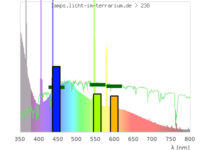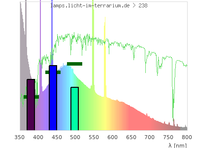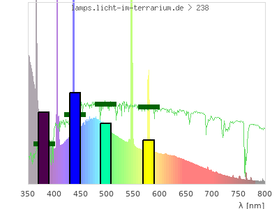 Whereas a spectrometer measures the intensity in every tiny wavelength interval resulting in thousands of individual intensities, the human eye only measures three intensities detected by the three cones. The same is true for the reptile eye with usually three or four photoreceptors. Effectively the detailled spectrum displayed above reduces to a much compacter bar graph displayed below. The photoreceptor sensitivites from these L-Cone, M-Cone, S-Cone, and U-Cone are used, they are chosen as an average of measured reptile photoreceptor sensitivity curves. The bar graph also shows as reference the intensity seen by the three or four photoreceptors for average sunlight (id 1).