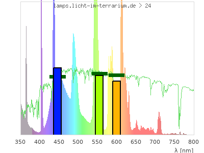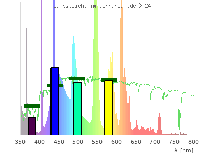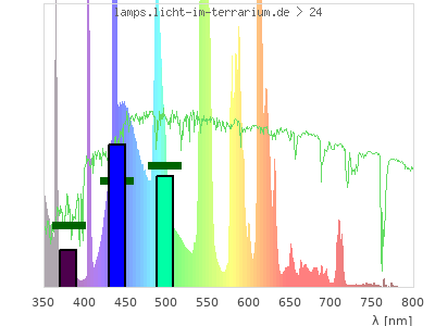 Whereas a spectrometer measures the intensity in every tiny wavelength interval resulting in thousands of individual intensities, the human eye only measures three intensities detected by the three cones. The same is true for the reptile eye with usually three or four photoreceptors. Effectively the detailled spectrum displayed above reduces to a much compacter bar graph displayed below. The photoreceptor sensitivites from these L-Cone, M-Cone, S-Cone, and U-Cone are used, they are chosen as an average of measured reptile photoreceptor sensitivity curves. The bar graph also shows as reference the intensity seen by the three or four photoreceptors for average sunlight (id 1).