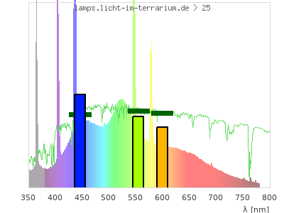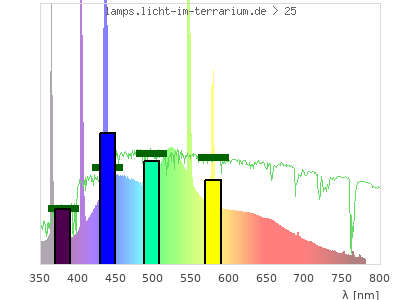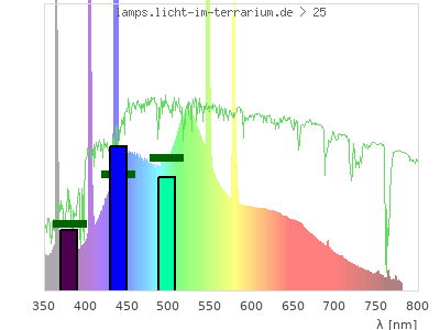 Whereas a spectrometer measures the intensity in every tiny wavelength interval resulting in thousands of individual intensities, the human eye only measures three intensities detected by the three cones. The same is true for the reptile eye with usually three or four photoreceptors. Effectively the detailled spectrum displayed above reduces to a much compacter bar graph displayed below. The photoreceptor sensitivites from these L-Cone, M-Cone, S-Cone, and U-Cone are used, they are chosen as an average of measured reptile photoreceptor sensitivity curves. The bar graph also shows as reference the intensity seen by the three or four photoreceptors for average sunlight (id 1).