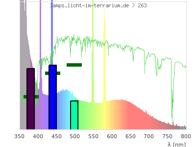 total ( 0 nm - 0 nm) 669 µW/cm² = 6.69 W/m² UVC ( 0 nm - 280 nm) 1.02 µW/cm² = 0.0102 W/m² non-terrestrial ( 0 nm - 290 nm) 1.39 µW/cm² = 0.0139 W/m² total2 ( 250 nm - 880 nm) 669 µW/cm² = 6.69 W/m² UVB (EU) ( 280 nm - 315 nm) 40.9 µW/cm² = 0.409 W/m² UVB (US) ( 280 nm - 320 nm) 64.4 µW/cm² = 0.644 W/m² UVA+B ( 280 nm - 380 nm) 313 µW/cm² = 3.13 W/m² Solar UVB ( 290 nm - 315 nm) 40.5 µW/cm² = 0.405 W/m² UVA D3 regulating ( 315 nm - 335 nm) 102 µW/cm² = 1.02 W/m² UVA (EU) ( 315 nm - 380 nm) 272 µW/cm² = 2.72 W/m² UVA2 (medical definition) ( 320 nm - 340 nm) 109 µW/cm² = 1.09 W/m² UVA (US) ( 320 nm - 380 nm) 249 µW/cm² = 2.49 W/m² UVA1 (variant) ( 335 nm - 380 nm) 170 µW/cm² = 1.7 W/m² UVA1 (medical) ( 340 nm - 400 nm) 165 µW/cm² = 1.65 W/m² vis. UVA ( 350 nm - 380 nm) 88.7 µW/cm² = 0.887 W/m² VIS Rep3 ( 350 nm - 600 nm) 370 µW/cm² = 3.7 W/m² VIS Rep4 ( 350 nm - 700 nm) 426 µW/cm² = 4.26 W/m² purple ( 380 nm - 420 nm) 60.7 µW/cm² = 0.607 W/m² VIS ( 380 nm - 780 nm) 351 µW/cm² = 3.51 W/m² VIS2 ( 400 nm - 680 nm) 305 µW/cm² = 3.05 W/m² PAR ( 400 nm - 700 nm) 313 µW/cm² = 3.13 W/m² tmp ( 400 nm - 1100 nm) 330 µW/cm² = 3.3 W/m² blue ( 420 nm - 490 nm) 117 µW/cm² = 1.17 W/m² green ( 490 nm - 575 nm) 79.1 µW/cm² = 0.791 W/m² yellow ( 575 nm - 585 nm) 13.6 µW/cm² = 0.136 W/m² orange ( 585 nm - 650 nm) 43.4 µW/cm² = 0.434 W/m² red ( 650 nm - 780 nm) 37.2 µW/cm² = 0.372 W/m² IRA ( 700 nm - 1400 nm) 16.9 µW/cm² = 0.169 W/m² IR2 ( 720 nm - 1100 nm) 11.4 µW/cm² = 0.114 W/m² IRB ( 1400 nm - 3000 nm) 0 µW/cm² = 0 W/m²