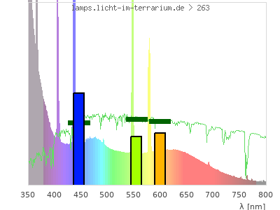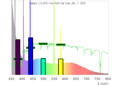 Whereas a spectrometer measures the intensity in every tiny wavelength interval resulting in thousands of individual intensities, the human eye only measures three intensities detected by the three cones. The same is true for the reptile eye with usually three or four photoreceptors. Effectively the detailled spectrum displayed above reduces to a much compacter bar graph displayed below. The photoreceptor sensitivites from these L-Cone, M-Cone, S-Cone, and U-Cone are used, they are chosen as an average of measured reptile photoreceptor sensitivity curves. The bar graph also shows as reference the intensity seen by the three or four photoreceptors for average sunlight (id 1).