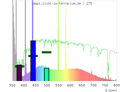 Whereas a spectrometer measures the intensity in every tiny wavelength interval resulting in thousands of individual intensities, the human eye only measures three intensities detected by the three cones. The same is true for the reptile eye with usually three or four photoreceptors. Effectively the detailled spectrum displayed above reduces to a much compacter bar graph displayed below. The photoreceptor sensitivites from these L-Cone, M-Cone, S-Cone, and U-Cone are used, they are chosen as an average of measured reptile photoreceptor sensitivity curves. The bar graph also shows as reference the intensity seen by the three or four photoreceptors for average sunlight (id 1).