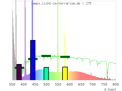 total ( 0 nm - 0 nm) 611 µW/cm² = 6.11 W/m² UVC ( 0 nm - 280 nm) 0.0532 µW/cm² = 0.000532 W/m² non-terrestrial ( 0 nm - 290 nm) 0.0693 µW/cm² = 0.000693 W/m² total2 ( 250 nm - 880 nm) 611 µW/cm² = 6.11 W/m² UVB (EU) ( 280 nm - 315 nm) 66.4 µW/cm² = 0.664 W/m² UVB (US) ( 280 nm - 320 nm) 105 µW/cm² = 1.05 W/m² UVA+B ( 280 nm - 380 nm) 338 µW/cm² = 3.38 W/m² Solar UVB ( 290 nm - 315 nm) 66.3 µW/cm² = 0.663 W/m² UVA D3 regulating ( 315 nm - 335 nm) 141 µW/cm² = 1.41 W/m² UVA (EU) ( 315 nm - 380 nm) 272 µW/cm² = 2.72 W/m² UVA2 (medical definition) ( 320 nm - 340 nm) 136 µW/cm² = 1.36 W/m² UVA (US) ( 320 nm - 380 nm) 233 µW/cm² = 2.33 W/m² UVA1 (variant) ( 335 nm - 380 nm) 131 µW/cm² = 1.31 W/m² UVA1 (medical) ( 340 nm - 400 nm) 101 µW/cm² = 1.01 W/m² vis. UVA ( 350 nm - 380 nm) 45.6 µW/cm² = 0.456 W/m² VIS Rep3 ( 350 nm - 600 nm) 270 µW/cm² = 2.7 W/m² VIS Rep4 ( 350 nm - 700 nm) 308 µW/cm² = 3.08 W/m² purple ( 380 nm - 420 nm) 29.7 µW/cm² = 0.297 W/m² VIS ( 380 nm - 780 nm) 272 µW/cm² = 2.72 W/m² VIS2 ( 400 nm - 680 nm) 254 µW/cm² = 2.54 W/m² PAR ( 400 nm - 700 nm) 259 µW/cm² = 2.59 W/m² tmp ( 400 nm - 1100 nm) 269 µW/cm² = 2.69 W/m² blue ( 420 nm - 490 nm) 115 µW/cm² = 1.15 W/m² green ( 490 nm - 575 nm) 60 µW/cm² = 0.6 W/m² yellow ( 575 nm - 585 nm) 12.5 µW/cm² = 0.125 W/m² orange ( 585 nm - 650 nm) 29.3 µW/cm² = 0.293 W/m² red ( 650 nm - 780 nm) 24.9 µW/cm² = 0.249 W/m² IRA ( 700 nm - 1400 nm) 9.97 µW/cm² = 0.0997 W/m² IR2 ( 720 nm - 1100 nm) 6.26 µW/cm² = 0.0626 W/m² IRB ( 1400 nm - 3000 nm) 0 µW/cm² = 0 W/m²