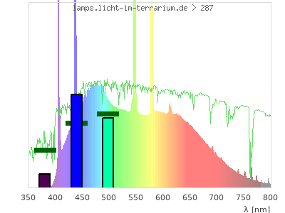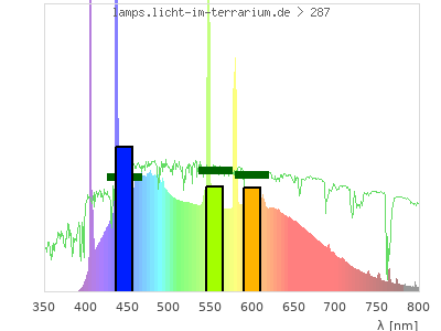 Whereas a spectrometer measures the intensity in every tiny wavelength interval resulting in thousands of individual intensities, the human eye only measures three intensities detected by the three cones. The same is true for the reptile eye with usually three or four photoreceptors. Effectively the detailled spectrum displayed above reduces to a much compacter bar graph displayed below. The photoreceptor sensitivites from these L-Cone, M-Cone, S-Cone, and U-Cone are used, they are chosen as an average of measured reptile photoreceptor sensitivity curves. The bar graph also shows as reference the intensity seen by the three or four photoreceptors for average sunlight (id 1).