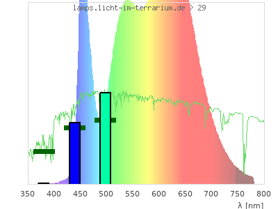 Whereas a spectrometer measures the intensity in every tiny wavelength interval resulting in thousands of individual intensities, the human eye only measures three intensities detected by the three cones. The same is true for the reptile eye with usually three or four photoreceptors. Effectively the detailled spectrum displayed above reduces to a much compacter bar graph displayed below. The photoreceptor sensitivites from these L-Cone, M-Cone, S-Cone, and U-Cone are used, they are chosen as an average of measured reptile photoreceptor sensitivity curves. The bar graph also shows as reference the intensity seen by the three or four photoreceptors for average sunlight (id 1).