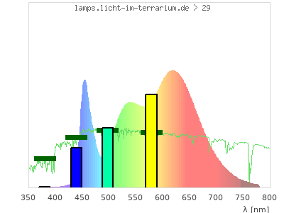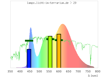 Erythema 4.62E-6 UV-Index Pyrimidine dimerization of DNA 0 µW/cm² Photoceratitis 0 µW/cm² Photoconjunctivitis 0 µW/cm² DNA Damage 0 Vitamin D3 0 µW/cm² Photosynthesis 115 µW/cm² Luminosity 551 lx Human L-Cone 85.3 µW/cm² Human M-Cone 62.8 µW/cm² Human S-Cone 22.5 µW/cm² CIE X 81.1 µW/cm² CIE Y 76.7 µW/cm² CIE Z 44.9 µW/cm² PAR PPFD 8.25 µmol/m²/s Extinction preD3 0 e-3*m²/mol Extinction Tachysterol 0 e-3*m²/mol Exctincition PreD3 0 m²/mol Extinction Lumisterol 0 m²/mol Exctincition Tachysterol 0 m²/mol Extinction 7DHC 0 m²/mol L-Cone 76.7 µW/cm² M-Cone 49.2 µW/cm² S-Cone 33 µW/cm² U-Cone 0.563 µW/cm² UVR - ICNIRP 2004 2.97E-6 Rel Biol Eff Melatonin Supression 34 µW/cm² Blue Light Hazard 23.3 µW/cm² (42.3 µW/cm² per 1000 lx) CIE 174:2006 PreVit D3 0 µW/cm² Lumen Reptil 418 "pseudo-lx" Vitamin D3 Degradation 0 µW/cm² Actinic UV 2.96E-6 µW/cm² (5.37E-5 mW/klm) Exctincition Lumisterol 0 m²/mol Exctincition 7DHC 0 m²/mol Exctincition Toxisterols 0 m²/mol