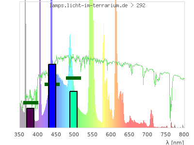 total ( 0 nm - 0 nm) 390 µW/cm² = 3.9 W/m² UVC ( 0 nm - 280 nm) 0.0932 µW/cm² = 0.000932 W/m² non-terrestrial ( 0 nm - 290 nm) 0.201 µW/cm² = 0.00201 W/m² total2 ( 250 nm - 880 nm) 390 µW/cm² = 3.9 W/m² UVB (EU) ( 280 nm - 315 nm) 22.1 µW/cm² = 0.221 W/m² UVB (US) ( 280 nm - 320 nm) 33 µW/cm² = 0.33 W/m² UVA+B ( 280 nm - 380 nm) 87.5 µW/cm² = 0.875 W/m² Solar UVB ( 290 nm - 315 nm) 22 µW/cm² = 0.22 W/m² UVA D3 regulating ( 315 nm - 335 nm) 36.9 µW/cm² = 0.369 W/m² UVA (EU) ( 315 nm - 380 nm) 65.4 µW/cm² = 0.654 W/m² UVA2 (medical definition) ( 320 nm - 340 nm) 31.6 µW/cm² = 0.316 W/m² UVA (US) ( 320 nm - 380 nm) 54.5 µW/cm² = 0.545 W/m² UVA1 (variant) ( 335 nm - 380 nm) 28.5 µW/cm² = 0.285 W/m² UVA1 (medical) ( 340 nm - 400 nm) 26 µW/cm² = 0.26 W/m² vis. UVA ( 350 nm - 380 nm) 16 µW/cm² = 0.16 W/m² VIS Rep3 ( 350 nm - 600 nm) 277 µW/cm² = 2.77 W/m² VIS Rep4 ( 350 nm - 700 nm) 314 µW/cm² = 3.14 W/m² purple ( 380 nm - 420 nm) 24.2 µW/cm² = 0.242 W/m² VIS ( 380 nm - 780 nm) 301 µW/cm² = 3.01 W/m² VIS2 ( 400 nm - 680 nm) 294 µW/cm² = 2.94 W/m² PAR ( 400 nm - 700 nm) 295 µW/cm² = 2.95 W/m² tmp ( 400 nm - 1100 nm) 299 µW/cm² = 2.99 W/m² blue ( 420 nm - 490 nm) 118 µW/cm² = 1.18 W/m² green ( 490 nm - 575 nm) 98.8 µW/cm² = 0.988 W/m² yellow ( 575 nm - 585 nm) 11.1 µW/cm² = 0.111 W/m² orange ( 585 nm - 650 nm) 40.8 µW/cm² = 0.408 W/m² red ( 650 nm - 780 nm) 8.54 µW/cm² = 0.0854 W/m² IRA ( 700 nm - 1400 nm) 3.82 µW/cm² = 0.0382 W/m² IR2 ( 720 nm - 1100 nm) 1.39 µW/cm² = 0.0139 W/m² IRB ( 1400 nm - 3000 nm) 0 µW/cm² = 0 W/m²