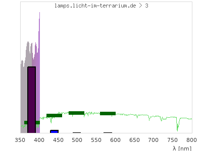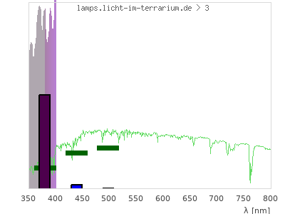total ( 0 nm - 0 nm) 5140 µW/cm² = 51.4 W/m² UVC ( 0 nm - 280 nm) 0 µW/cm² = 0 W/m² non-terrestrial ( 0 nm - 290 nm) 0 µW/cm² = 0 W/m² total2 ( 250 nm - 880 nm) 5140 µW/cm² = 51.4 W/m² UVB (EU) ( 280 nm - 315 nm) 155 µW/cm² = 1.55 W/m² UVB (US) ( 280 nm - 320 nm) 290 µW/cm² = 2.9 W/m² UVA+B ( 280 nm - 380 nm) 3740 µW/cm² = 37.4 W/m² Solar UVB ( 290 nm - 315 nm) 155 µW/cm² = 1.55 W/m² UVA D3 regulating ( 315 nm - 335 nm) 812 µW/cm² = 8.12 W/m² UVA (EU) ( 315 nm - 380 nm) 3590 µW/cm² = 35.9 W/m² UVA2 (medical definition) ( 320 nm - 340 nm) 931 µW/cm² = 9.31 W/m² UVA (US) ( 320 nm - 380 nm) 3450 µW/cm² = 34.5 W/m² UVA1 (variant) ( 335 nm - 380 nm) 2770 µW/cm² = 27.7 W/m² UVA1 (medical) ( 340 nm - 400 nm) 3920 µW/cm² = 39.2 W/m² vis. UVA ( 350 nm - 380 nm) 1980 µW/cm² = 19.8 W/m² VIS Rep3 ( 350 nm - 600 nm) 3380 µW/cm² = 33.8 W/m² VIS Rep4 ( 350 nm - 700 nm) 3380 µW/cm² = 33.8 W/m² purple ( 380 nm - 420 nm) 1400 µW/cm² = 14 W/m² VIS ( 380 nm - 780 nm) 1400 µW/cm² = 14 W/m² VIS2 ( 400 nm - 680 nm) 0 µW/cm² = 0 W/m² PAR ( 400 nm - 700 nm) 0 µW/cm² = 0 W/m² tmp ( 400 nm - 1100 nm) 0 µW/cm² = 0 W/m² blue ( 420 nm - 490 nm) 0 µW/cm² = 0 W/m² green ( 490 nm - 575 nm) 0 µW/cm² = 0 W/m² yellow ( 575 nm - 585 nm) 0 µW/cm² = 0 W/m² orange ( 585 nm - 650 nm) 0 µW/cm² = 0 W/m² red ( 650 nm - 780 nm) 0 µW/cm² = 0 W/m² IRA ( 700 nm - 1400 nm) 0 µW/cm² = 0 W/m² IR2 ( 720 nm - 1100 nm) 0 µW/cm² = 0 W/m² IRB ( 1400 nm - 3000 nm) 0 µW/cm² = 0 W/m²