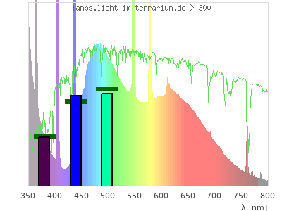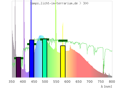 total ( 0 nm - 0 nm) 742 µW/cm² = 7.42 W/m² UVC ( 0 nm - 280 nm) 1.59 µW/cm² = 0.0159 W/m² non-terrestrial ( 0 nm - 290 nm) 2.05 µW/cm² = 0.0205 W/m² total2 ( 250 nm - 880 nm) 742 µW/cm² = 7.42 W/m² UVB (EU) ( 280 nm - 315 nm) 32.9 µW/cm² = 0.329 W/m² UVB (US) ( 280 nm - 320 nm) 51.5 µW/cm² = 0.515 W/m² UVA+B ( 280 nm - 380 nm) 205 µW/cm² = 2.05 W/m² Solar UVB ( 290 nm - 315 nm) 32.4 µW/cm² = 0.324 W/m² UVA D3 regulating ( 315 nm - 335 nm) 73.3 µW/cm² = 0.733 W/m² UVA (EU) ( 315 nm - 380 nm) 172 µW/cm² = 1.72 W/m² UVA2 (medical definition) ( 320 nm - 340 nm) 74.3 µW/cm² = 0.743 W/m² UVA (US) ( 320 nm - 380 nm) 154 µW/cm² = 1.54 W/m² UVA1 (variant) ( 335 nm - 380 nm) 99.1 µW/cm² = 0.991 W/m² UVA1 (medical) ( 340 nm - 400 nm) 90.6 µW/cm² = 0.906 W/m² vis. UVA ( 350 nm - 380 nm) 47.7 µW/cm² = 0.477 W/m² VIS Rep3 ( 350 nm - 600 nm) 425 µW/cm² = 4.25 W/m² VIS Rep4 ( 350 nm - 700 nm) 545 µW/cm² = 5.45 W/m² purple ( 380 nm - 420 nm) 32.6 µW/cm² = 0.326 W/m² VIS ( 380 nm - 780 nm) 526 µW/cm² = 5.26 W/m² VIS2 ( 400 nm - 680 nm) 470 µW/cm² = 4.7 W/m² PAR ( 400 nm - 700 nm) 486 µW/cm² = 4.86 W/m² tmp ( 400 nm - 1100 nm) 524 µW/cm² = 5.24 W/m² blue ( 420 nm - 490 nm) 146 µW/cm² = 1.46 W/m² green ( 490 nm - 575 nm) 158 µW/cm² = 1.58 W/m² yellow ( 575 nm - 585 nm) 19.4 µW/cm² = 0.194 W/m² orange ( 585 nm - 650 nm) 91.9 µW/cm² = 0.919 W/m² red ( 650 nm - 780 nm) 77.9 µW/cm² = 0.779 W/m² IRA ( 700 nm - 1400 nm) 37.7 µW/cm² = 0.377 W/m² IR2 ( 720 nm - 1100 nm) 26.4 µW/cm² = 0.264 W/m² IRB ( 1400 nm - 3000 nm) 0 µW/cm² = 0 W/m²