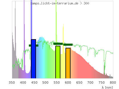 Whereas a spectrometer measures the intensity in every tiny wavelength interval resulting in thousands of individual intensities, the human eye only measures three intensities detected by the three cones. The same is true for the reptile eye with usually three or four photoreceptors. Effectively the detailled spectrum displayed above reduces to a much compacter bar graph displayed below. The photoreceptor sensitivites from these L-Cone, M-Cone, S-Cone, and U-Cone are used, they are chosen as an average of measured reptile photoreceptor sensitivity curves. The bar graph also shows as reference the intensity seen by the three or four photoreceptors for average sunlight (id 1).