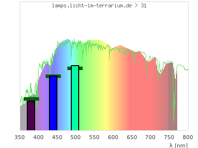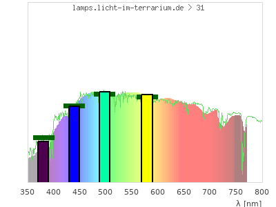 Whereas a spectrometer measures the intensity in every tiny wavelength interval resulting in thousands of individual intensities, the human eye only measures three intensities detected by the three cones. The same is true for the reptile eye with usually three or four photoreceptors. Effectively the detailled spectrum displayed above reduces to a much compacter bar graph displayed below. The photoreceptor sensitivites from these L-Cone, M-Cone, S-Cone, and U-Cone are used, they are chosen as an average of measured reptile photoreceptor sensitivity curves. The bar graph also shows as reference the intensity seen by the three or four photoreceptors for average sunlight (id 1).