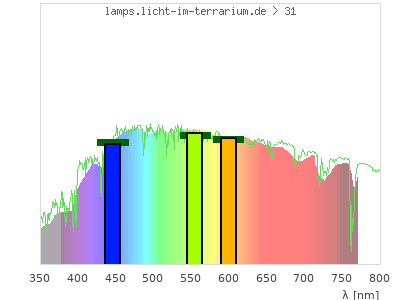 total ( 0 nm - 0 nm) 44500 µW/cm² = 445 W/m² UVC ( 0 nm - 280 nm) 0 µW/cm² = 0 W/m² non-terrestrial ( 0 nm - 290 nm) 0 µW/cm² = 0 W/m² total2 ( 250 nm - 880 nm) 44500 µW/cm² = 445 W/m² UVB (EU) ( 280 nm - 315 nm) 41.8 µW/cm² = 0.418 W/m² UVB (US) ( 280 nm - 320 nm) 92.9 µW/cm² = 0.929 W/m² UVA+B ( 280 nm - 380 nm) 2140 µW/cm² = 21.4 W/m² Solar UVB ( 290 nm - 315 nm) 41.8 µW/cm² = 0.418 W/m² UVA D3 regulating ( 315 nm - 335 nm) 381 µW/cm² = 3.81 W/m² UVA (EU) ( 315 nm - 380 nm) 2100 µW/cm² = 21 W/m² UVA2 (medical definition) ( 320 nm - 340 nm) 472 µW/cm² = 4.72 W/m² UVA (US) ( 320 nm - 380 nm) 2050 µW/cm² = 20.5 W/m² UVA1 (variant) ( 335 nm - 380 nm) 1720 µW/cm² = 17.2 W/m² UVA1 (medical) ( 340 nm - 400 nm) 2680 µW/cm² = 26.8 W/m² vis. UVA ( 350 nm - 380 nm) 1270 µW/cm² = 12.7 W/m² VIS Rep3 ( 350 nm - 600 nm) 26000 µW/cm² = 260 W/m² VIS Rep4 ( 350 nm - 700 nm) 37300 µW/cm² = 373 W/m² purple ( 380 nm - 420 nm) 2810 µW/cm² = 28.1 W/m² VIS ( 380 nm - 780 nm) 42300 µW/cm² = 423 W/m² VIS2 ( 400 nm - 680 nm) 32900 µW/cm² = 329 W/m² PAR ( 400 nm - 700 nm) 34900 µW/cm² = 349 W/m² tmp ( 400 nm - 1100 nm) 41200 µW/cm² = 412 W/m² blue ( 420 nm - 490 nm) 8140 µW/cm² = 81.4 W/m² green ( 490 nm - 575 nm) 10800 µW/cm² = 108 W/m² yellow ( 575 nm - 585 nm) 1240 µW/cm² = 12.4 W/m² orange ( 585 nm - 650 nm) 7710 µW/cm² = 77.1 W/m² red ( 650 nm - 780 nm) 11600 µW/cm² = 116 W/m² IRA ( 700 nm - 1400 nm) 6300 µW/cm² = 63 W/m² IR2 ( 720 nm - 1100 nm) 4350 µW/cm² = 43.5 W/m² IRB ( 1400 nm - 3000 nm) 0 µW/cm² = 0 W/m²