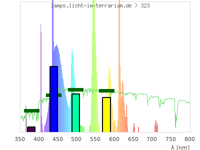 total ( 0 nm - 0 nm) 1150 µW/cm² = 11.5 W/m² UVC ( 0 nm - 280 nm) 0 µW/cm² = 0 W/m² non-terrestrial ( 0 nm - 290 nm) 0 µW/cm² = 0 W/m² total2 ( 250 nm - 880 nm) 1150 µW/cm² = 11.5 W/m² UVB (EU) ( 280 nm - 315 nm) 2.17 µW/cm² = 0.0217 W/m² UVB (US) ( 280 nm - 320 nm) 2.17 µW/cm² = 0.0217 W/m² UVA+B ( 280 nm - 380 nm) 7.88 µW/cm² = 0.0788 W/m² Solar UVB ( 290 nm - 315 nm) 2.17 µW/cm² = 0.0217 W/m² UVA D3 regulating ( 315 nm - 335 nm) 0 µW/cm² = 0 W/m² UVA (EU) ( 315 nm - 380 nm) 5.7 µW/cm² = 0.057 W/m² UVA2 (medical definition) ( 320 nm - 340 nm) 0 µW/cm² = 0 W/m² UVA (US) ( 320 nm - 380 nm) 5.7 µW/cm² = 0.057 W/m² UVA1 (variant) ( 335 nm - 380 nm) 5.7 µW/cm² = 0.057 W/m² UVA1 (medical) ( 340 nm - 400 nm) 5.7 µW/cm² = 0.057 W/m² vis. UVA ( 350 nm - 380 nm) 5.7 µW/cm² = 0.057 W/m² VIS Rep3 ( 350 nm - 600 nm) 997 µW/cm² = 9.97 W/m² VIS Rep4 ( 350 nm - 700 nm) 1140 µW/cm² = 11.4 W/m² purple ( 380 nm - 420 nm) 26.3 µW/cm² = 0.263 W/m² VIS ( 380 nm - 780 nm) 1140 µW/cm² = 11.4 W/m² VIS2 ( 400 nm - 680 nm) 1130 µW/cm² = 11.3 W/m² PAR ( 400 nm - 700 nm) 1130 µW/cm² = 11.3 W/m² tmp ( 400 nm - 1100 nm) 1140 µW/cm² = 11.4 W/m² blue ( 420 nm - 490 nm) 518 µW/cm² = 5.18 W/m² green ( 490 nm - 575 nm) 356 µW/cm² = 3.56 W/m² yellow ( 575 nm - 585 nm) 39 µW/cm² = 0.39 W/m² orange ( 585 nm - 650 nm) 191 µW/cm² = 1.91 W/m² red ( 650 nm - 780 nm) 9.5 µW/cm² = 0.095 W/m² IRA ( 700 nm - 1400 nm) 6.64 µW/cm² = 0.0664 W/m² IR2 ( 720 nm - 1100 nm) 0 µW/cm² = 0 W/m² IRB ( 1400 nm - 3000 nm) 0 µW/cm² = 0 W/m²