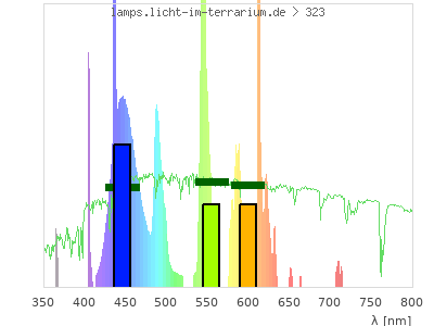 Whereas a spectrometer measures the intensity in every tiny wavelength interval resulting in thousands of individual intensities, the human eye only measures three intensities detected by the three cones. The same is true for the reptile eye with usually three or four photoreceptors. Effectively the detailled spectrum displayed above reduces to a much compacter bar graph displayed below. The photoreceptor sensitivites from these L-Cone, M-Cone, S-Cone, and U-Cone are used, they are chosen as an average of measured reptile photoreceptor sensitivity curves. The bar graph also shows as reference the intensity seen by the three or four photoreceptors for average sunlight (id 1).