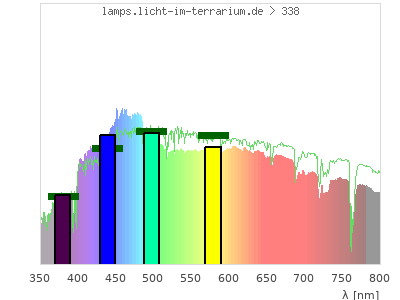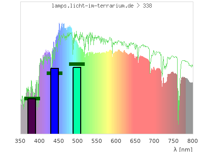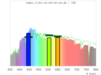 Whereas a spectrometer measures the intensity in every tiny wavelength interval resulting in thousands of individual intensities, the human eye only measures three intensities detected by the three cones. The same is true for the reptile eye with usually three or four photoreceptors. Effectively the detailled spectrum displayed above reduces to a much compacter bar graph displayed below. The photoreceptor sensitivites from these L-Cone, M-Cone, S-Cone, and U-Cone are used, they are chosen as an average of measured reptile photoreceptor sensitivity curves. The bar graph also shows as reference the intensity seen by the three or four photoreceptors for average sunlight (id 1).