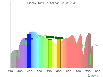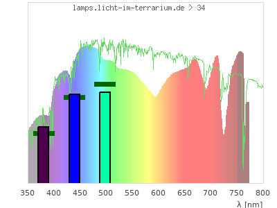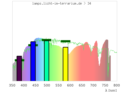 total ( 0 nm - 0 nm) 1240 µW/cm² = 12.4 W/m² UVC ( 0 nm - 280 nm) 0 µW/cm² = 0 W/m² non-terrestrial ( 0 nm - 290 nm) 0 µW/cm² = 0 W/m² total2 ( 250 nm - 880 nm) 1240 µW/cm² = 12.4 W/m² UVB (EU) ( 280 nm - 315 nm) 0.192 µW/cm² = 0.00192 W/m² UVB (US) ( 280 nm - 320 nm) 0.639 µW/cm² = 0.00639 W/m² UVA+B ( 280 nm - 380 nm) 81 µW/cm² = 0.81 W/m² Solar UVB ( 290 nm - 315 nm) 0.192 µW/cm² = 0.00192 W/m² UVA D3 regulating ( 315 nm - 335 nm) 10.1 µW/cm² = 0.101 W/m² UVA (EU) ( 315 nm - 380 nm) 80.8 µW/cm² = 0.808 W/m² UVA2 (medical definition) ( 320 nm - 340 nm) 15.7 µW/cm² = 0.157 W/m² UVA (US) ( 320 nm - 380 nm) 80.3 µW/cm² = 0.803 W/m² UVA1 (variant) ( 335 nm - 380 nm) 70.6 µW/cm² = 0.706 W/m² UVA1 (medical) ( 340 nm - 400 nm) 105 µW/cm² = 1.05 W/m² vis. UVA ( 350 nm - 380 nm) 51.2 µW/cm² = 0.512 W/m² VIS Rep3 ( 350 nm - 600 nm) 718 µW/cm² = 7.18 W/m² VIS Rep4 ( 350 nm - 700 nm) 1010 µW/cm² = 10.1 W/m² purple ( 380 nm - 420 nm) 98.2 µW/cm² = 0.982 W/m² VIS ( 380 nm - 780 nm) 1160 µW/cm² = 11.6 W/m² VIS2 ( 400 nm - 680 nm) 868 µW/cm² = 8.68 W/m² PAR ( 400 nm - 700 nm) 923 µW/cm² = 9.23 W/m² tmp ( 400 nm - 1100 nm) 1120 µW/cm² = 11.2 W/m² blue ( 420 nm - 490 nm) 244 µW/cm² = 2.44 W/m² green ( 490 nm - 575 nm) 263 µW/cm² = 2.63 W/m² yellow ( 575 nm - 585 nm) 25.5 µW/cm² = 0.255 W/m² orange ( 585 nm - 650 nm) 180 µW/cm² = 1.8 W/m² red ( 650 nm - 780 nm) 351 µW/cm² = 3.51 W/m² IRA ( 700 nm - 1400 nm) 198 µW/cm² = 1.98 W/m² IR2 ( 720 nm - 1100 nm) 137 µW/cm² = 1.37 W/m² IRB ( 1400 nm - 3000 nm) 0 µW/cm² = 0 W/m²