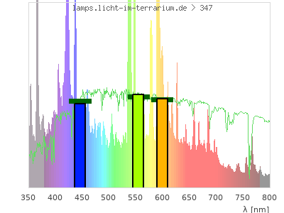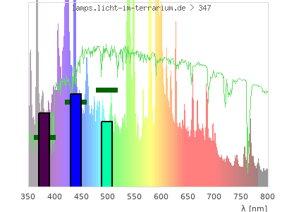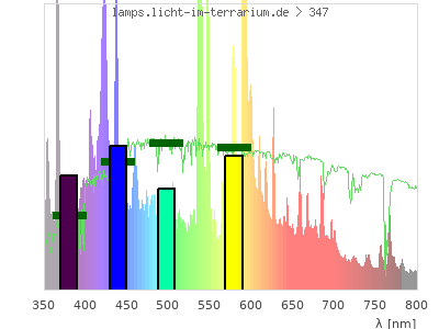 Whereas a spectrometer measures the intensity in every tiny wavelength interval resulting in thousands of individual intensities, the human eye only measures three intensities detected by the three cones. The same is true for the reptile eye with usually three or four photoreceptors. Effectively the detailled spectrum displayed above reduces to a much compacter bar graph displayed below. The photoreceptor sensitivites from these L-Cone, M-Cone, S-Cone, and U-Cone are used, they are chosen as an average of measured reptile photoreceptor sensitivity curves. The bar graph also shows as reference the intensity seen by the three or four photoreceptors for average sunlight (id 1).