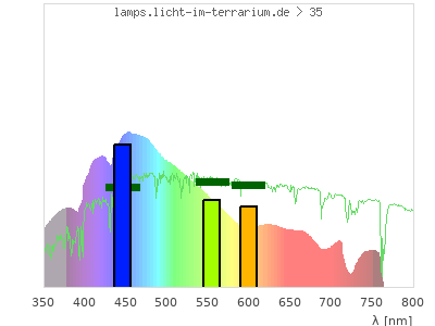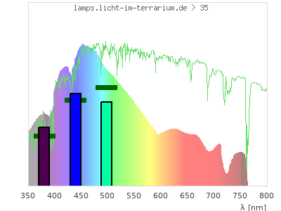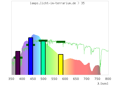 Whereas a spectrometer measures the intensity in every tiny wavelength interval resulting in thousands of individual intensities, the human eye only measures three intensities detected by the three cones. The same is true for the reptile eye with usually three or four photoreceptors. Effectively the detailled spectrum displayed above reduces to a much compacter bar graph displayed below. The photoreceptor sensitivites from these L-Cone, M-Cone, S-Cone, and U-Cone are used, they are chosen as an average of measured reptile photoreceptor sensitivity curves. The bar graph also shows as reference the intensity seen by the three or four photoreceptors for average sunlight (id 1).