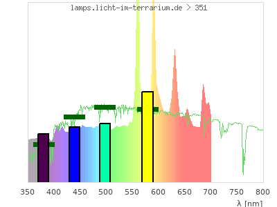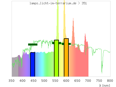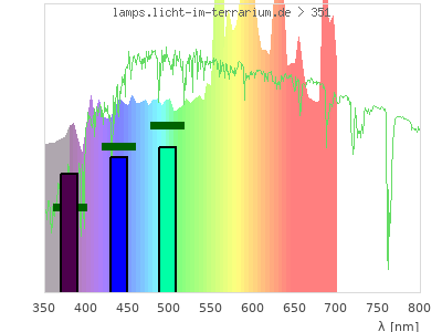 Whereas a spectrometer measures the intensity in every tiny wavelength interval resulting in thousands of individual intensities, the human eye only measures three intensities detected by the three cones. The same is true for the reptile eye with usually three or four photoreceptors. Effectively the detailled spectrum displayed above reduces to a much compacter bar graph displayed below. The photoreceptor sensitivites from these L-Cone, M-Cone, S-Cone, and U-Cone are used, they are chosen as an average of measured reptile photoreceptor sensitivity curves. The bar graph also shows as reference the intensity seen by the three or four photoreceptors for average sunlight (id 1).