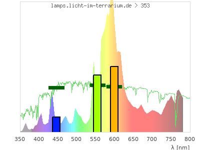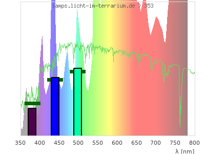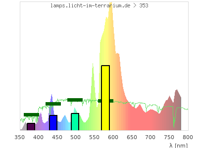 Whereas a spectrometer measures the intensity in every tiny wavelength interval resulting in thousands of individual intensities, the human eye only measures three intensities detected by the three cones. The same is true for the reptile eye with usually three or four photoreceptors. Effectively the detailled spectrum displayed above reduces to a much compacter bar graph displayed below. The photoreceptor sensitivites from these L-Cone, M-Cone, S-Cone, and U-Cone are used, they are chosen as an average of measured reptile photoreceptor sensitivity curves. The bar graph also shows as reference the intensity seen by the three or four photoreceptors for average sunlight (id 1).