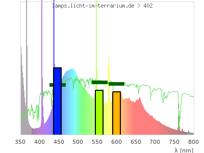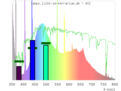 total ( 0 nm - 0 nm) 801 µW/cm² = 8.01 W/m² UVC ( 0 nm - 280 nm) 0.713 µW/cm² = 0.00713 W/m² non-terrestrial ( 0 nm - 290 nm) 1.05 µW/cm² = 0.0105 W/m² total2 ( 250 nm - 880 nm) 801 µW/cm² = 8.01 W/m² UVB (EU) ( 280 nm - 315 nm) 23.6 µW/cm² = 0.236 W/m² UVB (US) ( 280 nm - 320 nm) 42.6 µW/cm² = 0.426 W/m² UVA+B ( 280 nm - 380 nm) 237 µW/cm² = 2.37 W/m² Solar UVB ( 290 nm - 315 nm) 23.2 µW/cm² = 0.232 W/m² UVA D3 regulating ( 315 nm - 335 nm) 92.1 µW/cm² = 0.921 W/m² UVA (EU) ( 315 nm - 380 nm) 213 µW/cm² = 2.13 W/m² UVA2 (medical definition) ( 320 nm - 340 nm) 102 µW/cm² = 1.02 W/m² UVA (US) ( 320 nm - 380 nm) 194 µW/cm² = 1.94 W/m² UVA1 (variant) ( 335 nm - 380 nm) 121 µW/cm² = 1.21 W/m² UVA1 (medical) ( 340 nm - 400 nm) 97.5 µW/cm² = 0.975 W/m² vis. UVA ( 350 nm - 380 nm) 46 µW/cm² = 0.46 W/m² VIS Rep3 ( 350 nm - 600 nm) 456 µW/cm² = 4.56 W/m² VIS Rep4 ( 350 nm - 700 nm) 573 µW/cm² = 5.73 W/m² purple ( 380 nm - 420 nm) 31 µW/cm² = 0.31 W/m² VIS ( 380 nm - 780 nm) 552 µW/cm² = 5.52 W/m² VIS2 ( 400 nm - 680 nm) 508 µW/cm² = 5.08 W/m² PAR ( 400 nm - 700 nm) 522 µW/cm² = 5.22 W/m² tmp ( 400 nm - 1100 nm) 559 µW/cm² = 5.59 W/m² blue ( 420 nm - 490 nm) 182 µW/cm² = 1.82 W/m² green ( 490 nm - 575 nm) 160 µW/cm² = 1.6 W/m² yellow ( 575 nm - 585 nm) 17.5 µW/cm² = 0.175 W/m² orange ( 585 nm - 650 nm) 87.4 µW/cm² = 0.874 W/m² red ( 650 nm - 780 nm) 73.6 µW/cm² = 0.736 W/m² IRA ( 700 nm - 1400 nm) 36.5 µW/cm² = 0.365 W/m² IR2 ( 720 nm - 1100 nm) 26.8 µW/cm² = 0.268 W/m² IRB ( 1400 nm - 3000 nm) 0 µW/cm² = 0 W/m²