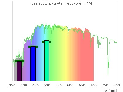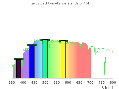 total ( 0 nm - 0 nm) 19700 µW/cm² = 197 W/m² UVC ( 0 nm - 280 nm) 0 µW/cm² = 0 W/m² non-terrestrial ( 0 nm - 290 nm) 0 µW/cm² = 0 W/m² total2 ( 250 nm - 880 nm) 19700 µW/cm² = 197 W/m² UVB (EU) ( 280 nm - 315 nm) 0 µW/cm² = 0 W/m² UVB (US) ( 280 nm - 320 nm) 0 µW/cm² = 0 W/m² UVA+B ( 280 nm - 380 nm) 653 µW/cm² = 6.53 W/m² Solar UVB ( 290 nm - 315 nm) 0 µW/cm² = 0 W/m² UVA D3 regulating ( 315 nm - 335 nm) 0 µW/cm² = 0 W/m² UVA (EU) ( 315 nm - 380 nm) 653 µW/cm² = 6.53 W/m² UVA2 (medical definition) ( 320 nm - 340 nm) 0 µW/cm² = 0 W/m² UVA (US) ( 320 nm - 380 nm) 653 µW/cm² = 6.53 W/m² UVA1 (variant) ( 335 nm - 380 nm) 653 µW/cm² = 6.53 W/m² UVA1 (medical) ( 340 nm - 400 nm) 1220 µW/cm² = 12.2 W/m² vis. UVA ( 350 nm - 380 nm) 653 µW/cm² = 6.53 W/m² VIS Rep3 ( 350 nm - 600 nm) 13700 µW/cm² = 137 W/m² VIS Rep4 ( 350 nm - 700 nm) 19700 µW/cm² = 197 W/m² purple ( 380 nm - 420 nm) 1530 µW/cm² = 15.3 W/m² VIS ( 380 nm - 780 nm) 19100 µW/cm² = 191 W/m² VIS2 ( 400 nm - 680 nm) 17400 µW/cm² = 174 W/m² PAR ( 400 nm - 700 nm) 18500 µW/cm² = 185 W/m² tmp ( 400 nm - 1100 nm) 18500 µW/cm² = 185 W/m² blue ( 420 nm - 490 nm) 4260 µW/cm² = 42.6 W/m² green ( 490 nm - 575 nm) 5640 µW/cm² = 56.4 W/m² yellow ( 575 nm - 585 nm) 659 µW/cm² = 6.59 W/m² orange ( 585 nm - 650 nm) 4090 µW/cm² = 40.9 W/m² red ( 650 nm - 780 nm) 2900 µW/cm² = 29 W/m² IRA ( 700 nm - 1400 nm) 0 µW/cm² = 0 W/m² IR2 ( 720 nm - 1100 nm) 0 µW/cm² = 0 W/m² IRB ( 1400 nm - 3000 nm) 0 µW/cm² = 0 W/m²