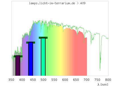 total ( 0 nm - 0 nm) 46600 µW/cm² = 466 W/m² UVC ( 0 nm - 280 nm) 0 µW/cm² = 0 W/m² non-terrestrial ( 0 nm - 290 nm) 0 µW/cm² = 0 W/m² total2 ( 250 nm - 880 nm) 46600 µW/cm² = 466 W/m² UVB (EU) ( 280 nm - 315 nm) 0 µW/cm² = 0 W/m² UVB (US) ( 280 nm - 320 nm) 0 µW/cm² = 0 W/m² UVA+B ( 280 nm - 380 nm) 1740 µW/cm² = 17.4 W/m² Solar UVB ( 290 nm - 315 nm) 0 µW/cm² = 0 W/m² UVA D3 regulating ( 315 nm - 335 nm) 0 µW/cm² = 0 W/m² UVA (EU) ( 315 nm - 380 nm) 1740 µW/cm² = 17.4 W/m² UVA2 (medical definition) ( 320 nm - 340 nm) 0 µW/cm² = 0 W/m² UVA (US) ( 320 nm - 380 nm) 1740 µW/cm² = 17.4 W/m² UVA1 (variant) ( 335 nm - 380 nm) 1740 µW/cm² = 17.4 W/m² UVA1 (medical) ( 340 nm - 400 nm) 3240 µW/cm² = 32.4 W/m² vis. UVA ( 350 nm - 380 nm) 1740 µW/cm² = 17.4 W/m² VIS Rep3 ( 350 nm - 600 nm) 33000 µW/cm² = 330 W/m² VIS Rep4 ( 350 nm - 700 nm) 46600 µW/cm² = 466 W/m² purple ( 380 nm - 420 nm) 3980 µW/cm² = 39.8 W/m² VIS ( 380 nm - 780 nm) 44800 µW/cm² = 448 W/m² VIS2 ( 400 nm - 680 nm) 40900 µW/cm² = 409 W/m² PAR ( 400 nm - 700 nm) 43300 µW/cm² = 433 W/m² tmp ( 400 nm - 1100 nm) 43300 µW/cm² = 433 W/m² blue ( 420 nm - 490 nm) 10500 µW/cm² = 105 W/m² green ( 490 nm - 575 nm) 13200 µW/cm² = 132 W/m² yellow ( 575 nm - 585 nm) 1530 µW/cm² = 15.3 W/m² orange ( 585 nm - 650 nm) 9290 µW/cm² = 92.9 W/m² red ( 650 nm - 780 nm) 6360 µW/cm² = 63.6 W/m² IRA ( 700 nm - 1400 nm) 0 µW/cm² = 0 W/m² IR2 ( 720 nm - 1100 nm) 0 µW/cm² = 0 W/m² IRB ( 1400 nm - 3000 nm) 0 µW/cm² = 0 W/m²