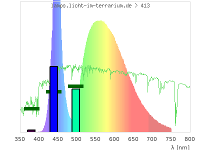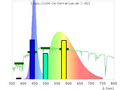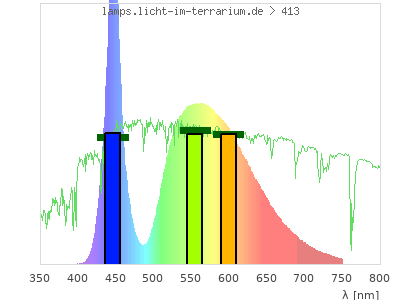 total ( 0 nm - 0 nm) 10200 µW/cm² = 102 W/m² UVC ( 0 nm - 280 nm) 0 µW/cm² = 0 W/m² non-terrestrial ( 0 nm - 290 nm) 0 µW/cm² = 0 W/m² total2 ( 250 nm - 880 nm) 10200 µW/cm² = 102 W/m² UVB (EU) ( 280 nm - 315 nm) 0 µW/cm² = 0 W/m² UVB (US) ( 280 nm - 320 nm) 0 µW/cm² = 0 W/m² UVA+B ( 280 nm - 380 nm) 0 µW/cm² = 0 W/m² Solar UVB ( 290 nm - 315 nm) 0 µW/cm² = 0 W/m² UVA D3 regulating ( 315 nm - 335 nm) 0 µW/cm² = 0 W/m² UVA (EU) ( 315 nm - 380 nm) 0 µW/cm² = 0 W/m² UVA2 (medical definition) ( 320 nm - 340 nm) 0 µW/cm² = 0 W/m² UVA (US) ( 320 nm - 380 nm) 0 µW/cm² = 0 W/m² UVA1 (variant) ( 335 nm - 380 nm) 0 µW/cm² = 0 W/m² UVA1 (medical) ( 340 nm - 400 nm) 0.206 µW/cm² = 0.00206 W/m² vis. UVA ( 350 nm - 380 nm) 0 µW/cm² = 0 W/m² VIS Rep3 ( 350 nm - 600 nm) 7650 µW/cm² = 76.5 W/m² VIS Rep4 ( 350 nm - 700 nm) 10000 µW/cm² = 100 W/m² purple ( 380 nm - 420 nm) 45.7 µW/cm² = 0.457 W/m² VIS ( 380 nm - 780 nm) 10200 µW/cm² = 102 W/m² VIS2 ( 400 nm - 680 nm) 9840 µW/cm² = 98.4 W/m² PAR ( 400 nm - 700 nm) 10000 µW/cm² = 100 W/m² tmp ( 400 nm - 1100 nm) 10200 µW/cm² = 102 W/m² blue ( 420 nm - 490 nm) 2840 µW/cm² = 28.4 W/m² green ( 490 nm - 575 nm) 3500 µW/cm² = 35 W/m² yellow ( 575 nm - 585 nm) 540 µW/cm² = 5.4 W/m² orange ( 585 nm - 650 nm) 2420 µW/cm² = 24.2 W/m² red ( 650 nm - 780 nm) 886 µW/cm² = 8.86 W/m² IRA ( 700 nm - 1400 nm) 203 µW/cm² = 2.03 W/m² IR2 ( 720 nm - 1100 nm) 89.2 µW/cm² = 0.892 W/m² IRB ( 1400 nm - 3000 nm) 0 µW/cm² = 0 W/m²