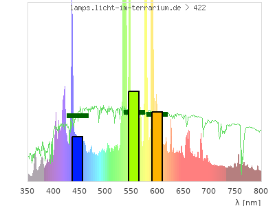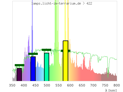 Whereas a spectrometer measures the intensity in every tiny wavelength interval resulting in thousands of individual intensities, the human eye only measures three intensities detected by the three cones. The same is true for the reptile eye with usually three or four photoreceptors. Effectively the detailled spectrum displayed above reduces to a much compacter bar graph displayed below. The photoreceptor sensitivites from these L-Cone, M-Cone, S-Cone, and U-Cone are used, they are chosen as an average of measured reptile photoreceptor sensitivity curves. The bar graph also shows as reference the intensity seen by the three or four photoreceptors for average sunlight (id 1).