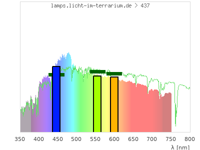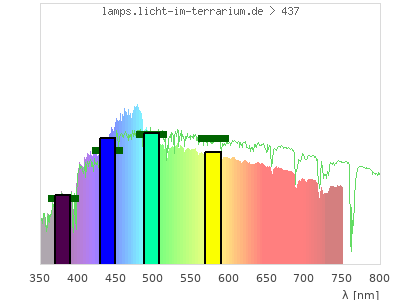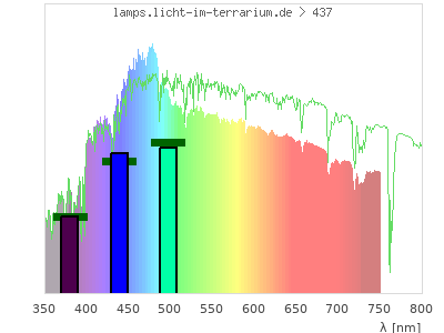 Whereas a spectrometer measures the intensity in every tiny wavelength interval resulting in thousands of individual intensities, the human eye only measures three intensities detected by the three cones. The same is true for the reptile eye with usually three or four photoreceptors. Effectively the detailled spectrum displayed above reduces to a much compacter bar graph displayed below. The photoreceptor sensitivites from these L-Cone, M-Cone, S-Cone, and U-Cone are used, they are chosen as an average of measured reptile photoreceptor sensitivity curves. The bar graph also shows as reference the intensity seen by the three or four photoreceptors for average sunlight (id 1).