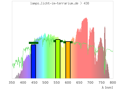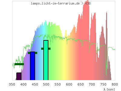 total ( 0 nm - 0 nm) 495 µW/cm² = 4.95 W/m² UVC ( 0 nm - 280 nm) 0 µW/cm² = 0 W/m² non-terrestrial ( 0 nm - 290 nm) 0 µW/cm² = 0 W/m² total2 ( 250 nm - 880 nm) 495 µW/cm² = 4.95 W/m² UVB (EU) ( 280 nm - 315 nm) 0 µW/cm² = 0 W/m² UVB (US) ( 280 nm - 320 nm) 0 µW/cm² = 0 W/m² UVA+B ( 280 nm - 380 nm) 1.59 µW/cm² = 0.0159 W/m² Solar UVB ( 290 nm - 315 nm) 0 µW/cm² = 0 W/m² UVA D3 regulating ( 315 nm - 335 nm) 0 µW/cm² = 0 W/m² UVA (EU) ( 315 nm - 380 nm) 1.59 µW/cm² = 0.0159 W/m² UVA2 (medical definition) ( 320 nm - 340 nm) 0 µW/cm² = 0 W/m² UVA (US) ( 320 nm - 380 nm) 1.59 µW/cm² = 0.0159 W/m² UVA1 (variant) ( 335 nm - 380 nm) 1.59 µW/cm² = 0.0159 W/m² UVA1 (medical) ( 340 nm - 400 nm) 6.18 µW/cm² = 0.0618 W/m² vis. UVA ( 350 nm - 380 nm) 1.59 µW/cm² = 0.0159 W/m² VIS Rep3 ( 350 nm - 600 nm) 252 µW/cm² = 2.52 W/m² VIS Rep4 ( 350 nm - 700 nm) 412 µW/cm² = 4.12 W/m² purple ( 380 nm - 420 nm) 17.9 µW/cm² = 0.179 W/m² VIS ( 380 nm - 780 nm) 493 µW/cm² = 4.93 W/m² VIS2 ( 400 nm - 680 nm) 374 µW/cm² = 3.74 W/m² PAR ( 400 nm - 700 nm) 405 µW/cm² = 4.05 W/m² tmp ( 400 nm - 1100 nm) 488 µW/cm² = 4.88 W/m² blue ( 420 nm - 490 nm) 83.2 µW/cm² = 0.832 W/m² green ( 490 nm - 575 nm) 120 µW/cm² = 1.2 W/m² yellow ( 575 nm - 585 nm) 11.9 µW/cm² = 0.119 W/m² orange ( 585 nm - 650 nm) 88 µW/cm² = 0.88 W/m² red ( 650 nm - 780 nm) 172 µW/cm² = 1.72 W/m² IRA ( 700 nm - 1400 nm) 83 µW/cm² = 0.83 W/m² IR2 ( 720 nm - 1100 nm) 54.2 µW/cm² = 0.542 W/m² IRB ( 1400 nm - 3000 nm) 0 µW/cm² = 0 W/m²