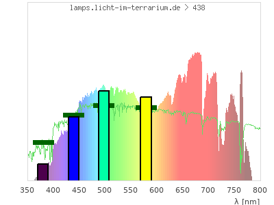 Whereas a spectrometer measures the intensity in every tiny wavelength interval resulting in thousands of individual intensities, the human eye only measures three intensities detected by the three cones. The same is true for the reptile eye with usually three or four photoreceptors. Effectively the detailled spectrum displayed above reduces to a much compacter bar graph displayed below. The photoreceptor sensitivites from these L-Cone, M-Cone, S-Cone, and U-Cone are used, they are chosen as an average of measured reptile photoreceptor sensitivity curves. The bar graph also shows as reference the intensity seen by the three or four photoreceptors for average sunlight (id 1).