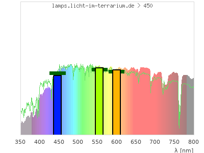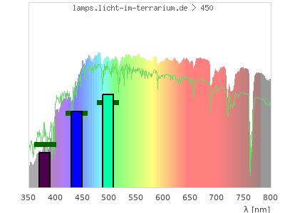 total ( 0 nm - 0 nm) 36600 µW/cm² = 366 W/m² UVC ( 0 nm - 280 nm) 0 µW/cm² = 0 W/m² non-terrestrial ( 0 nm - 290 nm) 0 µW/cm² = 0 W/m² total2 ( 250 nm - 880 nm) 36500 µW/cm² = 365 W/m² UVB (EU) ( 280 nm - 315 nm) 6.88 µW/cm² = 0.0688 W/m² UVB (US) ( 280 nm - 320 nm) 23.3 µW/cm² = 0.233 W/m² UVA+B ( 280 nm - 380 nm) 908 µW/cm² = 9.08 W/m² Solar UVB ( 290 nm - 315 nm) 6.88 µW/cm² = 0.0688 W/m² UVA D3 regulating ( 315 nm - 335 nm) 135 µW/cm² = 1.35 W/m² UVA (EU) ( 315 nm - 380 nm) 901 µW/cm² = 9.01 W/m² UVA2 (medical definition) ( 320 nm - 340 nm) 173 µW/cm² = 1.73 W/m² UVA (US) ( 320 nm - 380 nm) 885 µW/cm² = 8.85 W/m² UVA1 (variant) ( 335 nm - 380 nm) 766 µW/cm² = 7.66 W/m² UVA1 (medical) ( 340 nm - 400 nm) 1260 µW/cm² = 12.6 W/m² vis. UVA ( 350 nm - 380 nm) 587 µW/cm² = 5.87 W/m² VIS Rep3 ( 350 nm - 600 nm) 16300 µW/cm² = 163 W/m² VIS Rep4 ( 350 nm - 700 nm) 24300 µW/cm² = 243 W/m² purple ( 380 nm - 420 nm) 1600 µW/cm² = 16 W/m² VIS ( 380 nm - 780 nm) 29100 µW/cm² = 291 W/m² VIS2 ( 400 nm - 680 nm) 21700 µW/cm² = 217 W/m² PAR ( 400 nm - 700 nm) 23100 µW/cm² = 231 W/m² tmp ( 400 nm - 1100 nm) 35100 µW/cm² = 351 W/m² blue ( 420 nm - 490 nm) 5130 µW/cm² = 51.3 W/m² green ( 490 nm - 575 nm) 6980 µW/cm² = 69.8 W/m² yellow ( 575 nm - 585 nm) 842 µW/cm² = 8.42 W/m² orange ( 585 nm - 650 nm) 5240 µW/cm² = 52.4 W/m² red ( 650 nm - 780 nm) 9280 µW/cm² = 92.8 W/m² IRA ( 700 nm - 1400 nm) 12000 µW/cm² = 120 W/m² IR2 ( 720 nm - 1100 nm) 10600 µW/cm² = 106 W/m² IRB ( 1400 nm - 3000 nm) 0 µW/cm² = 0 W/m²