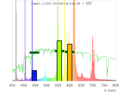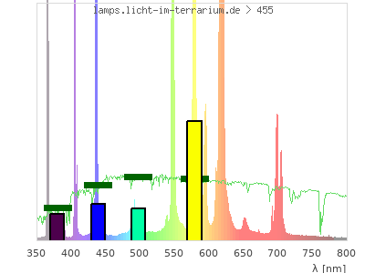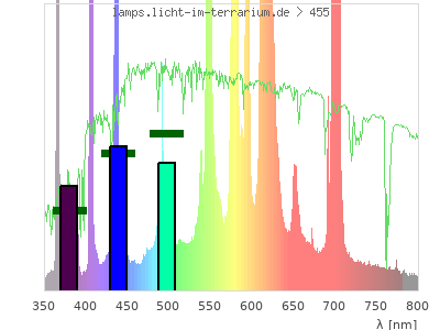 Whereas a spectrometer measures the intensity in every tiny wavelength interval resulting in thousands of individual intensities, the human eye only measures three intensities detected by the three cones. The same is true for the reptile eye with usually three or four photoreceptors. Effectively the detailled spectrum displayed above reduces to a much compacter bar graph displayed below. The photoreceptor sensitivites from these L-Cone, M-Cone, S-Cone, and U-Cone are used, they are chosen as an average of measured reptile photoreceptor sensitivity curves. The bar graph also shows as reference the intensity seen by the three or four photoreceptors for average sunlight (id 1).