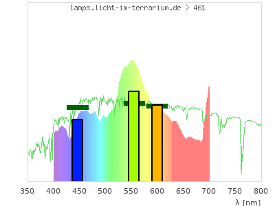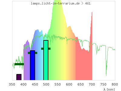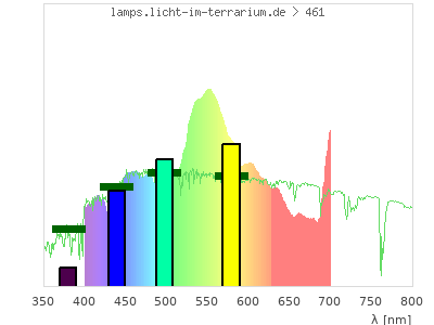total ( 0 nm - 0 nm) 3020 µW/cm² = 30.2 W/m² UVC ( 0 nm - 280 nm) 0 µW/cm² = 0 W/m² non-terrestrial ( 0 nm - 290 nm) 0 µW/cm² = 0 W/m² total2 ( 250 nm - 880 nm) 3020 µW/cm² = 30.2 W/m² UVB (EU) ( 280 nm - 315 nm) 0 µW/cm² = 0 W/m² UVB (US) ( 280 nm - 320 nm) 0 µW/cm² = 0 W/m² UVA+B ( 280 nm - 380 nm) 0 µW/cm² = 0 W/m² Solar UVB ( 290 nm - 315 nm) 0 µW/cm² = 0 W/m² UVA D3 regulating ( 315 nm - 335 nm) 0 µW/cm² = 0 W/m² UVA (EU) ( 315 nm - 380 nm) 0 µW/cm² = 0 W/m² UVA2 (medical definition) ( 320 nm - 340 nm) 0 µW/cm² = 0 W/m² UVA (US) ( 320 nm - 380 nm) 0 µW/cm² = 0 W/m² UVA1 (variant) ( 335 nm - 380 nm) 0 µW/cm² = 0 W/m² UVA1 (medical) ( 340 nm - 400 nm) 0 µW/cm² = 0 W/m² vis. UVA ( 350 nm - 380 nm) 0 µW/cm² = 0 W/m² VIS Rep3 ( 350 nm - 600 nm) 2210 µW/cm² = 22.1 W/m² VIS Rep4 ( 350 nm - 700 nm) 3020 µW/cm² = 30.2 W/m² purple ( 380 nm - 420 nm) 156 µW/cm² = 1.56 W/m² VIS ( 380 nm - 780 nm) 3020 µW/cm² = 30.2 W/m² VIS2 ( 400 nm - 680 nm) 2850 µW/cm² = 28.5 W/m² PAR ( 400 nm - 700 nm) 3020 µW/cm² = 30.2 W/m² tmp ( 400 nm - 1100 nm) 3020 µW/cm² = 30.2 W/m² blue ( 420 nm - 490 nm) 618 µW/cm² = 6.18 W/m² green ( 490 nm - 575 nm) 1160 µW/cm² = 11.6 W/m² yellow ( 575 nm - 585 nm) 125 µW/cm² = 1.25 W/m² orange ( 585 nm - 650 nm) 605 µW/cm² = 6.05 W/m² red ( 650 nm - 780 nm) 360 µW/cm² = 3.6 W/m² IRA ( 700 nm - 1400 nm) 0 µW/cm² = 0 W/m² IR2 ( 720 nm - 1100 nm) 0 µW/cm² = 0 W/m² IRB ( 1400 nm - 3000 nm) 0 µW/cm² = 0 W/m²