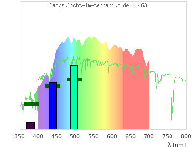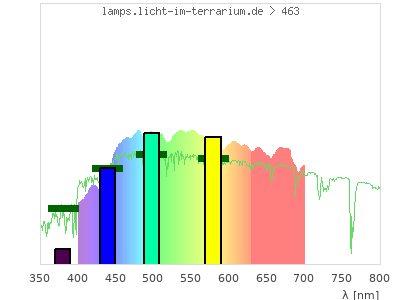 total ( 0 nm - 0 nm) 3640 µW/cm² = 36.4 W/m² UVC ( 0 nm - 280 nm) 0 µW/cm² = 0 W/m² non-terrestrial ( 0 nm - 290 nm) 0 µW/cm² = 0 W/m² total2 ( 250 nm - 880 nm) 3640 µW/cm² = 36.4 W/m² UVB (EU) ( 280 nm - 315 nm) 0 µW/cm² = 0 W/m² UVB (US) ( 280 nm - 320 nm) 0 µW/cm² = 0 W/m² UVA+B ( 280 nm - 380 nm) 0 µW/cm² = 0 W/m² Solar UVB ( 290 nm - 315 nm) 0 µW/cm² = 0 W/m² UVA D3 regulating ( 315 nm - 335 nm) 0 µW/cm² = 0 W/m² UVA (EU) ( 315 nm - 380 nm) 0 µW/cm² = 0 W/m² UVA2 (medical definition) ( 320 nm - 340 nm) 0 µW/cm² = 0 W/m² UVA (US) ( 320 nm - 380 nm) 0 µW/cm² = 0 W/m² UVA1 (variant) ( 335 nm - 380 nm) 0 µW/cm² = 0 W/m² UVA1 (medical) ( 340 nm - 400 nm) 0 µW/cm² = 0 W/m² vis. UVA ( 350 nm - 380 nm) 0 µW/cm² = 0 W/m² VIS Rep3 ( 350 nm - 600 nm) 2450 µW/cm² = 24.5 W/m² VIS Rep4 ( 350 nm - 700 nm) 3640 µW/cm² = 36.4 W/m² purple ( 380 nm - 420 nm) 149 µW/cm² = 1.49 W/m² VIS ( 380 nm - 780 nm) 3640 µW/cm² = 36.4 W/m² VIS2 ( 400 nm - 680 nm) 3440 µW/cm² = 34.4 W/m² PAR ( 400 nm - 700 nm) 3640 µW/cm² = 36.4 W/m² tmp ( 400 nm - 1100 nm) 3640 µW/cm² = 36.4 W/m² blue ( 420 nm - 490 nm) 816 µW/cm² = 8.16 W/m² green ( 490 nm - 575 nm) 1170 µW/cm² = 11.7 W/m² yellow ( 575 nm - 585 nm) 134 µW/cm² = 1.34 W/m² orange ( 585 nm - 650 nm) 809 µW/cm² = 8.09 W/m² red ( 650 nm - 780 nm) 565 µW/cm² = 5.65 W/m² IRA ( 700 nm - 1400 nm) 0 µW/cm² = 0 W/m² IR2 ( 720 nm - 1100 nm) 0 µW/cm² = 0 W/m² IRB ( 1400 nm - 3000 nm) 0 µW/cm² = 0 W/m²