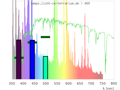 Whereas a spectrometer measures the intensity in every tiny wavelength interval resulting in thousands of individual intensities, the human eye only measures three intensities detected by the three cones. The same is true for the reptile eye with usually three or four photoreceptors. Effectively the detailled spectrum displayed above reduces to a much compacter bar graph displayed below. The photoreceptor sensitivites from these L-Cone, M-Cone, S-Cone, and U-Cone are used, they are chosen as an average of measured reptile photoreceptor sensitivity curves. The bar graph also shows as reference the intensity seen by the three or four photoreceptors for average sunlight (id 1).