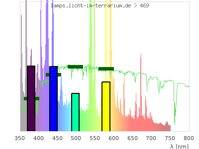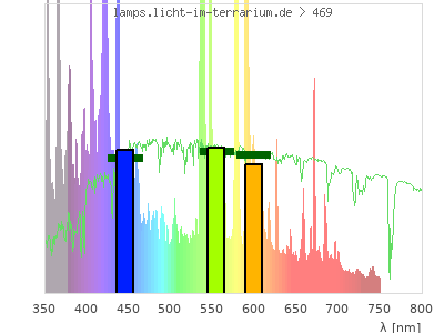 total ( 0 nm - 0 nm) 74800 µW/cm² = 748 W/m² UVC ( 0 nm - 280 nm) 0 µW/cm² = 0 W/m² non-terrestrial ( 0 nm - 290 nm) 0 µW/cm² = 0 W/m² total2 ( 250 nm - 880 nm) 74800 µW/cm² = 748 W/m² UVB (EU) ( 280 nm - 315 nm) 216 µW/cm² = 2.16 W/m² UVB (US) ( 280 nm - 320 nm) 285 µW/cm² = 2.85 W/m² UVA+B ( 280 nm - 380 nm) 11000 µW/cm² = 110 W/m² Solar UVB ( 290 nm - 315 nm) 216 µW/cm² = 2.16 W/m² UVA D3 regulating ( 315 nm - 335 nm) 528 µW/cm² = 5.28 W/m² UVA (EU) ( 315 nm - 380 nm) 10800 µW/cm² = 108 W/m² UVA2 (medical definition) ( 320 nm - 340 nm) 706 µW/cm² = 7.06 W/m² UVA (US) ( 320 nm - 380 nm) 10700 µW/cm² = 107 W/m² UVA1 (variant) ( 335 nm - 380 nm) 10200 µW/cm² = 102 W/m² UVA1 (medical) ( 340 nm - 400 nm) 14300 µW/cm² = 143 W/m² vis. UVA ( 350 nm - 380 nm) 9300 µW/cm² = 93 W/m² VIS Rep3 ( 350 nm - 600 nm) 62800 µW/cm² = 628 W/m² VIS Rep4 ( 350 nm - 700 nm) 71400 µW/cm² = 714 W/m² purple ( 380 nm - 420 nm) 10700 µW/cm² = 107 W/m² VIS ( 380 nm - 780 nm) 63800 µW/cm² = 638 W/m² VIS2 ( 400 nm - 680 nm) 56400 µW/cm² = 564 W/m² PAR ( 400 nm - 700 nm) 57800 µW/cm² = 578 W/m² tmp ( 400 nm - 1100 nm) 59500 µW/cm² = 595 W/m² blue ( 420 nm - 490 nm) 16000 µW/cm² = 160 W/m² green ( 490 nm - 575 nm) 18300 µW/cm² = 183 W/m² yellow ( 575 nm - 585 nm) 3250 µW/cm² = 32.5 W/m² orange ( 585 nm - 650 nm) 9950 µW/cm² = 99.5 W/m² red ( 650 nm - 780 nm) 5650 µW/cm² = 56.5 W/m² IRA ( 700 nm - 1400 nm) 1680 µW/cm² = 16.8 W/m² IR2 ( 720 nm - 1100 nm) 941 µW/cm² = 9.41 W/m² IRB ( 1400 nm - 3000 nm) 0 µW/cm² = 0 W/m²