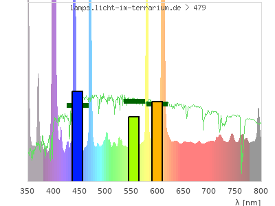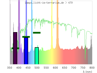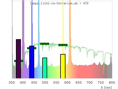 Whereas a spectrometer measures the intensity in every tiny wavelength interval resulting in thousands of individual intensities, the human eye only measures three intensities detected by the three cones. The same is true for the reptile eye with usually three or four photoreceptors. Effectively the detailled spectrum displayed above reduces to a much compacter bar graph displayed below. The photoreceptor sensitivites from these L-Cone, M-Cone, S-Cone, and U-Cone are used, they are chosen as an average of measured reptile photoreceptor sensitivity curves. The bar graph also shows as reference the intensity seen by the three or four photoreceptors for average sunlight (id 1).