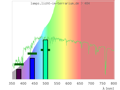 total ( 0 nm - 0 nm) 28100 µW/cm² = 281 W/m² UVC ( 0 nm - 280 nm) 0 µW/cm² = 0 W/m² non-terrestrial ( 0 nm - 290 nm) 0 µW/cm² = 0 W/m² total2 ( 250 nm - 880 nm) 7010 µW/cm² = 70.1 W/m² UVB (EU) ( 280 nm - 315 nm) 4.64 µW/cm² = 0.0464 W/m² UVB (US) ( 280 nm - 320 nm) 7.54 µW/cm² = 0.0754 W/m² UVA+B ( 280 nm - 380 nm) 65.4 µW/cm² = 0.654 W/m² Solar UVB ( 290 nm - 315 nm) 4.64 µW/cm² = 0.0464 W/m² UVA D3 regulating ( 315 nm - 335 nm) 12.1 µW/cm² = 0.121 W/m² UVA (EU) ( 315 nm - 380 nm) 60.8 µW/cm² = 0.608 W/m² UVA2 (medical definition) ( 320 nm - 340 nm) 13.6 µW/cm² = 0.136 W/m² UVA (US) ( 320 nm - 380 nm) 57.9 µW/cm² = 0.579 W/m² UVA1 (variant) ( 335 nm - 380 nm) 48.7 µW/cm² = 0.487 W/m² UVA1 (medical) ( 340 nm - 400 nm) 75.1 µW/cm² = 0.751 W/m² vis. UVA ( 350 nm - 380 nm) 36.4 µW/cm² = 0.364 W/m² VIS Rep3 ( 350 nm - 600 nm) 1410 µW/cm² = 14.1 W/m² VIS Rep4 ( 350 nm - 700 nm) 3050 µW/cm² = 30.5 W/m² purple ( 380 nm - 420 nm) 78.6 µW/cm² = 0.786 W/m² VIS ( 380 nm - 780 nm) 4660 µW/cm² = 46.6 W/m² VIS2 ( 400 nm - 680 nm) 2580 µW/cm² = 25.8 W/m² PAR ( 400 nm - 700 nm) 2990 µW/cm² = 29.9 W/m² tmp ( 400 nm - 1100 nm) 12600 µW/cm² = 126 W/m² blue ( 420 nm - 490 nm) 291 µW/cm² = 2.91 W/m² green ( 490 nm - 575 nm) 711 µW/cm² = 7.11 W/m² yellow ( 575 nm - 585 nm) 105 µW/cm² = 1.05 W/m² orange ( 585 nm - 650 nm) 949 µW/cm² = 9.49 W/m² red ( 650 nm - 780 nm) 2520 µW/cm² = 25.2 W/m² IRA ( 700 nm - 1400 nm) 16400 µW/cm² = 164 W/m² IR2 ( 720 nm - 1100 nm) 9240 µW/cm² = 92.4 W/m² IRB ( 1400 nm - 3000 nm) 8650 µW/cm² = 86.5 W/m²