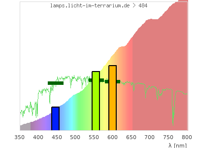 Whereas a spectrometer measures the intensity in every tiny wavelength interval resulting in thousands of individual intensities, the human eye only measures three intensities detected by the three cones. The same is true for the reptile eye with usually three or four photoreceptors. Effectively the detailled spectrum displayed above reduces to a much compacter bar graph displayed below. The photoreceptor sensitivites from these L-Cone, M-Cone, S-Cone, and U-Cone are used, they are chosen as an average of measured reptile photoreceptor sensitivity curves. The bar graph also shows as reference the intensity seen by the three or four photoreceptors for average sunlight (id 1).