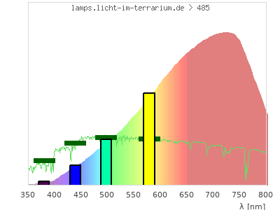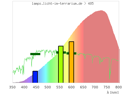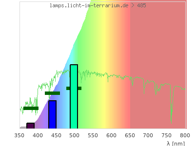 Whereas a spectrometer measures the intensity in every tiny wavelength interval resulting in thousands of individual intensities, the human eye only measures three intensities detected by the three cones. The same is true for the reptile eye with usually three or four photoreceptors. Effectively the detailled spectrum displayed above reduces to a much compacter bar graph displayed below. The photoreceptor sensitivites from these L-Cone, M-Cone, S-Cone, and U-Cone are used, they are chosen as an average of measured reptile photoreceptor sensitivity curves. The bar graph also shows as reference the intensity seen by the three or four photoreceptors for average sunlight (id 1).