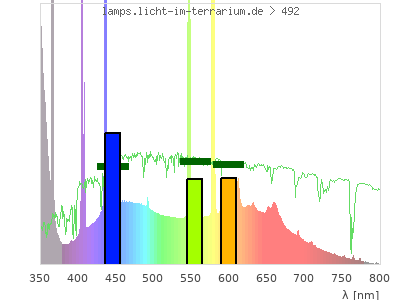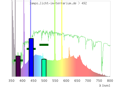 Whereas a spectrometer measures the intensity in every tiny wavelength interval resulting in thousands of individual intensities, the human eye only measures three intensities detected by the three cones. The same is true for the reptile eye with usually three or four photoreceptors. Effectively the detailled spectrum displayed above reduces to a much compacter bar graph displayed below. The photoreceptor sensitivites from these L-Cone, M-Cone, S-Cone, and U-Cone are used, they are chosen as an average of measured reptile photoreceptor sensitivity curves. The bar graph also shows as reference the intensity seen by the three or four photoreceptors for average sunlight (id 1).