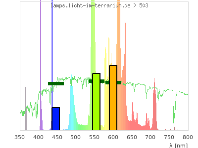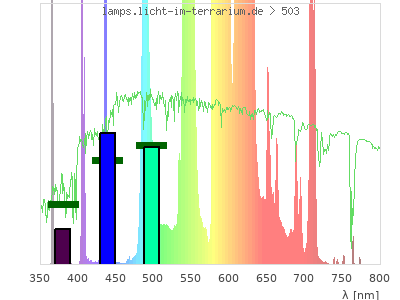 total ( 0 nm - 0 nm) 1580 µW/cm² = 15.8 W/m² UVC ( 0 nm - 280 nm) 0 µW/cm² = 0 W/m² non-terrestrial ( 0 nm - 290 nm) 0 µW/cm² = 0 W/m² total2 ( 250 nm - 880 nm) 1580 µW/cm² = 15.8 W/m² UVB (EU) ( 280 nm - 315 nm) 0 µW/cm² = 0 W/m² UVB (US) ( 280 nm - 320 nm) 0.0644 µW/cm² = 0.000644 W/m² UVA+B ( 280 nm - 380 nm) 10.8 µW/cm² = 0.108 W/m² Solar UVB ( 290 nm - 315 nm) 0 µW/cm² = 0 W/m² UVA D3 regulating ( 315 nm - 335 nm) 0.0644 µW/cm² = 0.000644 W/m² UVA (EU) ( 315 nm - 380 nm) 10.8 µW/cm² = 0.108 W/m² UVA2 (medical definition) ( 320 nm - 340 nm) 0 µW/cm² = 0 W/m² UVA (US) ( 320 nm - 380 nm) 10.7 µW/cm² = 0.107 W/m² UVA1 (variant) ( 335 nm - 380 nm) 10.7 µW/cm² = 0.107 W/m² UVA1 (medical) ( 340 nm - 400 nm) 10.7 µW/cm² = 0.107 W/m² vis. UVA ( 350 nm - 380 nm) 10.7 µW/cm² = 0.107 W/m² VIS Rep3 ( 350 nm - 600 nm) 891 µW/cm² = 8.91 W/m² VIS Rep4 ( 350 nm - 700 nm) 1540 µW/cm² = 15.4 W/m² purple ( 380 nm - 420 nm) 55.7 µW/cm² = 0.557 W/m² VIS ( 380 nm - 780 nm) 1570 µW/cm² = 15.7 W/m² VIS2 ( 400 nm - 680 nm) 1510 µW/cm² = 15.1 W/m² PAR ( 400 nm - 700 nm) 1530 µW/cm² = 15.3 W/m² tmp ( 400 nm - 1100 nm) 1570 µW/cm² = 15.7 W/m² blue ( 420 nm - 490 nm) 208 µW/cm² = 2.08 W/m² green ( 490 nm - 575 nm) 447 µW/cm² = 4.47 W/m² yellow ( 575 nm - 585 nm) 65.3 µW/cm² = 0.653 W/m² orange ( 585 nm - 650 nm) 697 µW/cm² = 6.97 W/m² red ( 650 nm - 780 nm) 100 µW/cm² = 1 W/m² IRA ( 700 nm - 1400 nm) 46.1 µW/cm² = 0.461 W/m² IR2 ( 720 nm - 1100 nm) 1.73 µW/cm² = 0.0173 W/m² IRB ( 1400 nm - 3000 nm) 0 µW/cm² = 0 W/m²