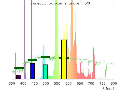 Whereas a spectrometer measures the intensity in every tiny wavelength interval resulting in thousands of individual intensities, the human eye only measures three intensities detected by the three cones. The same is true for the reptile eye with usually three or four photoreceptors. Effectively the detailled spectrum displayed above reduces to a much compacter bar graph displayed below. The photoreceptor sensitivites from these L-Cone, M-Cone, S-Cone, and U-Cone are used, they are chosen as an average of measured reptile photoreceptor sensitivity curves. The bar graph also shows as reference the intensity seen by the three or four photoreceptors for average sunlight (id 1).