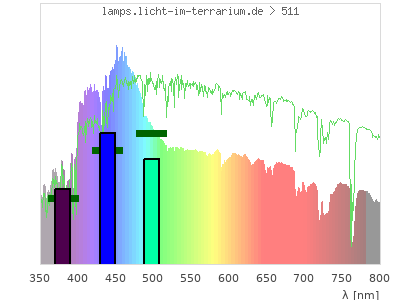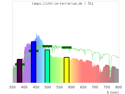 Whereas a spectrometer measures the intensity in every tiny wavelength interval resulting in thousands of individual intensities, the human eye only measures three intensities detected by the three cones. The same is true for the reptile eye with usually three or four photoreceptors. Effectively the detailled spectrum displayed above reduces to a much compacter bar graph displayed below. The photoreceptor sensitivites from these L-Cone, M-Cone, S-Cone, and U-Cone are used, they are chosen as an average of measured reptile photoreceptor sensitivity curves. The bar graph also shows as reference the intensity seen by the three or four photoreceptors for average sunlight (id 1).