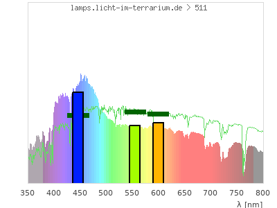 total ( 0 nm - 0 nm) 4060 µW/cm² = 40.6 W/m² UVC ( 0 nm - 280 nm) 0 µW/cm² = 0 W/m² non-terrestrial ( 0 nm - 290 nm) 0 µW/cm² = 0 W/m² total2 ( 250 nm - 880 nm) 4050 µW/cm² = 40.5 W/m² UVB (EU) ( 280 nm - 315 nm) 2.71 µW/cm² = 0.0271 W/m² UVB (US) ( 280 nm - 320 nm) 8.17 µW/cm² = 0.0817 W/m² UVA+B ( 280 nm - 380 nm) 294 µW/cm² = 2.94 W/m² Solar UVB ( 290 nm - 315 nm) 2.71 µW/cm² = 0.0271 W/m² UVA D3 regulating ( 315 nm - 335 nm) 51.5 µW/cm² = 0.515 W/m² UVA (EU) ( 315 nm - 380 nm) 291 µW/cm² = 2.91 W/m² UVA2 (medical definition) ( 320 nm - 340 nm) 66.7 µW/cm² = 0.667 W/m² UVA (US) ( 320 nm - 380 nm) 286 µW/cm² = 2.86 W/m² UVA1 (variant) ( 335 nm - 380 nm) 240 µW/cm² = 2.4 W/m² UVA1 (medical) ( 340 nm - 400 nm) 350 µW/cm² = 3.5 W/m² vis. UVA ( 350 nm - 380 nm) 175 µW/cm² = 1.75 W/m² VIS Rep3 ( 350 nm - 600 nm) 2420 µW/cm² = 24.2 W/m² VIS Rep4 ( 350 nm - 700 nm) 3140 µW/cm² = 31.4 W/m² purple ( 380 nm - 420 nm) 376 µW/cm² = 3.76 W/m² VIS ( 380 nm - 780 nm) 3350 µW/cm² = 33.5 W/m² VIS2 ( 400 nm - 680 nm) 2710 µW/cm² = 27.1 W/m² PAR ( 400 nm - 700 nm) 2830 µW/cm² = 28.3 W/m² tmp ( 400 nm - 1100 nm) 3630 µW/cm² = 36.3 W/m² blue ( 420 nm - 490 nm) 934 µW/cm² = 9.34 W/m² green ( 490 nm - 575 nm) 742 µW/cm² = 7.42 W/m² yellow ( 575 nm - 585 nm) 81 µW/cm² = 0.81 W/m² orange ( 585 nm - 650 nm) 499 µW/cm² = 4.99 W/m² red ( 650 nm - 780 nm) 719 µW/cm² = 7.19 W/m² IRA ( 700 nm - 1400 nm) 798 µW/cm² = 7.98 W/m² IR2 ( 720 nm - 1100 nm) 693 µW/cm² = 6.93 W/m² IRB ( 1400 nm - 3000 nm) 0 µW/cm² = 0 W/m²