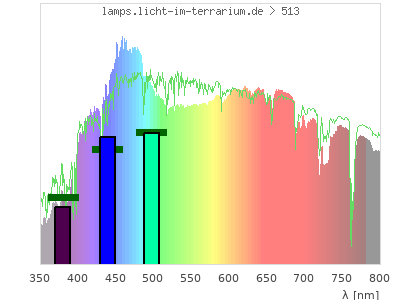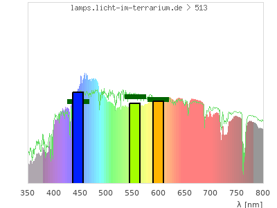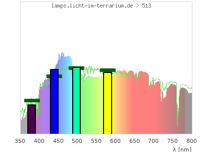 Whereas a spectrometer measures the intensity in every tiny wavelength interval resulting in thousands of individual intensities, the human eye only measures three intensities detected by the three cones. The same is true for the reptile eye with usually three or four photoreceptors. Effectively the detailled spectrum displayed above reduces to a much compacter bar graph displayed below. The photoreceptor sensitivites from these L-Cone, M-Cone, S-Cone, and U-Cone are used, they are chosen as an average of measured reptile photoreceptor sensitivity curves. The bar graph also shows as reference the intensity seen by the three or four photoreceptors for average sunlight (id 1).
