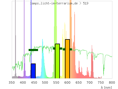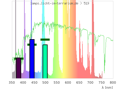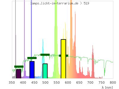 Whereas a spectrometer measures the intensity in every tiny wavelength interval resulting in thousands of individual intensities, the human eye only measures three intensities detected by the three cones. The same is true for the reptile eye with usually three or four photoreceptors. Effectively the detailled spectrum displayed above reduces to a much compacter bar graph displayed below. The photoreceptor sensitivites from these L-Cone, M-Cone, S-Cone, and U-Cone are used, they are chosen as an average of measured reptile photoreceptor sensitivity curves. The bar graph also shows as reference the intensity seen by the three or four photoreceptors for average sunlight (id 1).