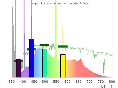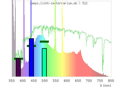 Whereas a spectrometer measures the intensity in every tiny wavelength interval resulting in thousands of individual intensities, the human eye only measures three intensities detected by the three cones. The same is true for the reptile eye with usually three or four photoreceptors. Effectively the detailled spectrum displayed above reduces to a much compacter bar graph displayed below. The photoreceptor sensitivites from these L-Cone, M-Cone, S-Cone, and U-Cone are used, they are chosen as an average of measured reptile photoreceptor sensitivity curves. The bar graph also shows as reference the intensity seen by the three or four photoreceptors for average sunlight (id 1).